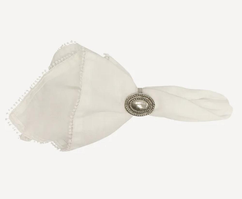Crafted from stonewashed French linen, this set of four napkins features an intricate beaded lace border that elevates any dining experience. Their soft texture and refined edge balance elegance with casual sophistication, making them ideal for both everyday meals and special occasions. Durable and breathable, these white napkins bring a timeless charm to your table setting while ensuring comfort and style.